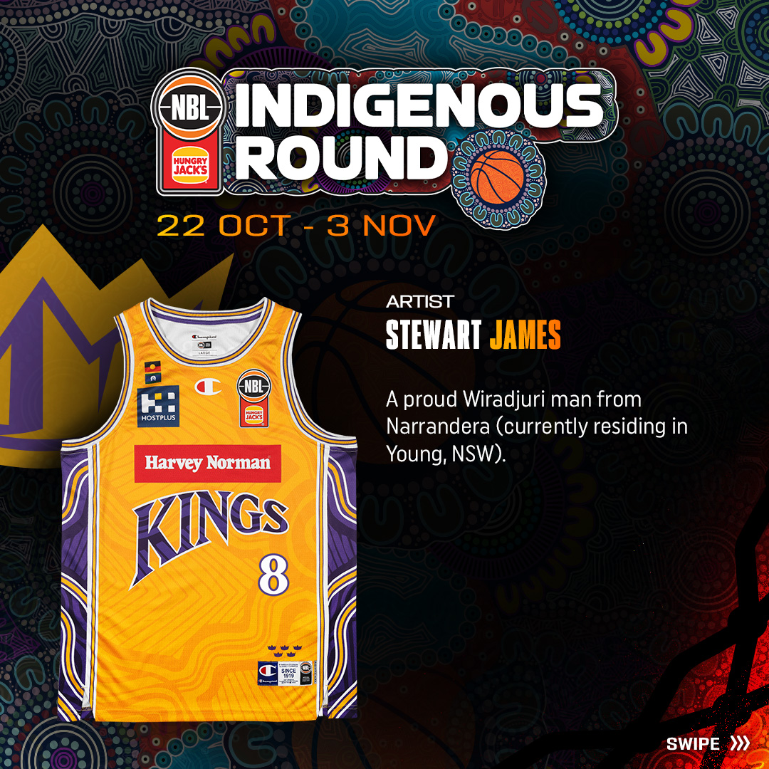 Artist bio: Stewart James is a proud Wiradjuri man from Narrandera (currently residing in Young, NSW). He has more than 20 years of experience as an artist and more than 15 years working in education. The NBL26 season will be his fifth working with the Hoops Capital club.